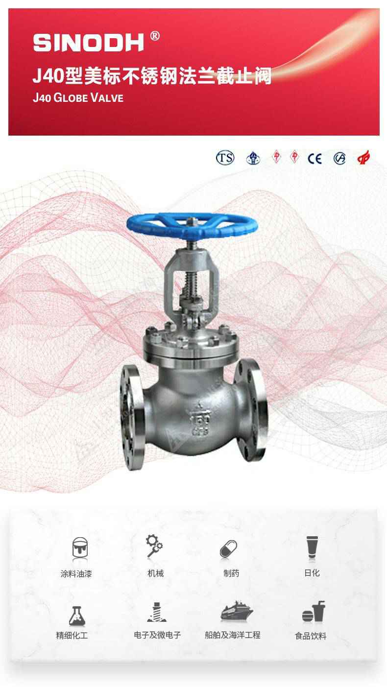 J40型美标不锈钢截止阀,为长春振华旅游电子商务有限公司自主研发生产。本产品的设计制造符合美国国家标准ANSIB16.34,美国石油学会标准AP1 6D和AP I 600要求,产品结构紧凑密、刚性好、封性性能优秀是一种最常见的启闭阀,利用闸板的上下工作来接通(全开)和截断(全关)管道中的流体介质。