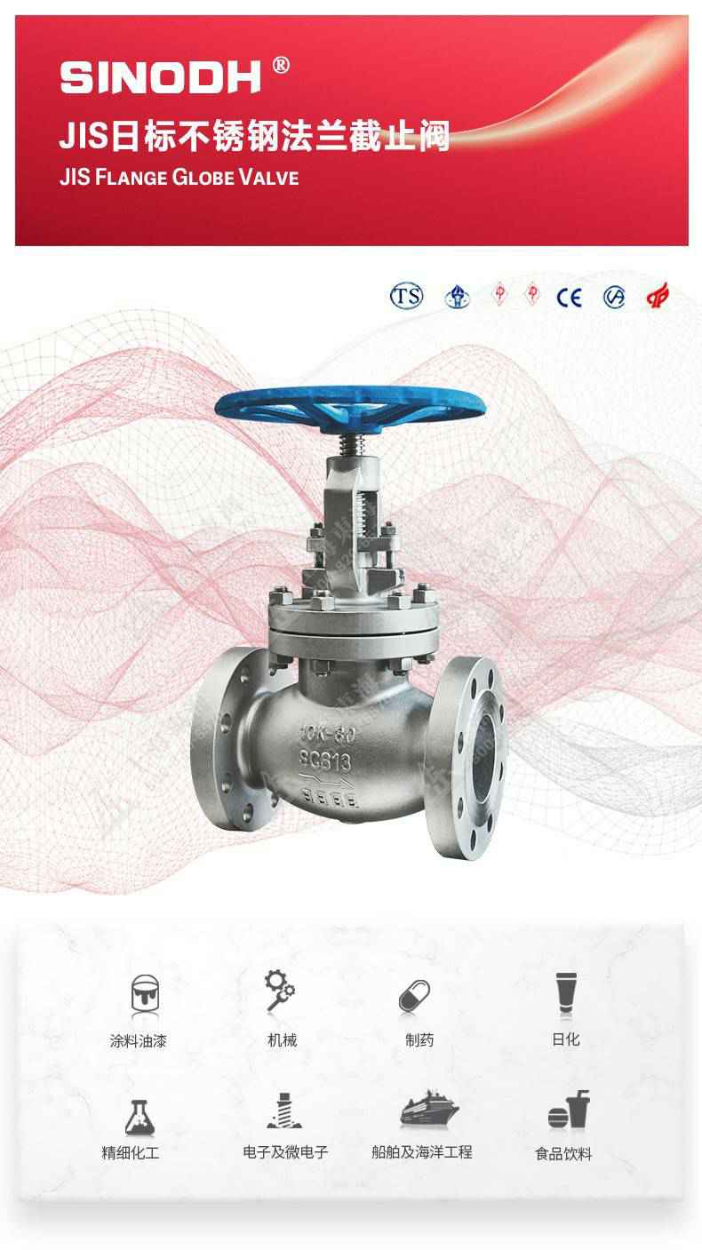 JIS日标不锈钢法兰截止阀,为长春振华旅游电子商务有限公司自主研发生产。本产品设计制造标准符合J1SB2071标准,其启闭件是圆柱形的阀瓣,密封面呈平面或锥面,阀瓣沿流体的中心线作直线运动。国标截止阀只适用于全.开和全关,一般不用来调节流量,定做时允许作调节和节流。