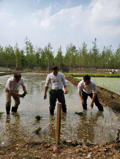日前,南宫体育平台官方网站-南宫(中国)董事长梁雨、总裁谢俊率集团高级管理人员来到位于北京西四环外的锦绣大地生态园,在景色迷人的玉泉山山下,同志们挽起裤脚跃进田里,生态园农业技术员一边弓腰示范,一边讲解道“插秧是个技术活,将秧苗窝在虎口处,既要轻又要稳,用巧劲儿将秧苗抛在泥里,不能抛得太深,又要确保植保灌溉时,秧苗不漂浮在水面上。”